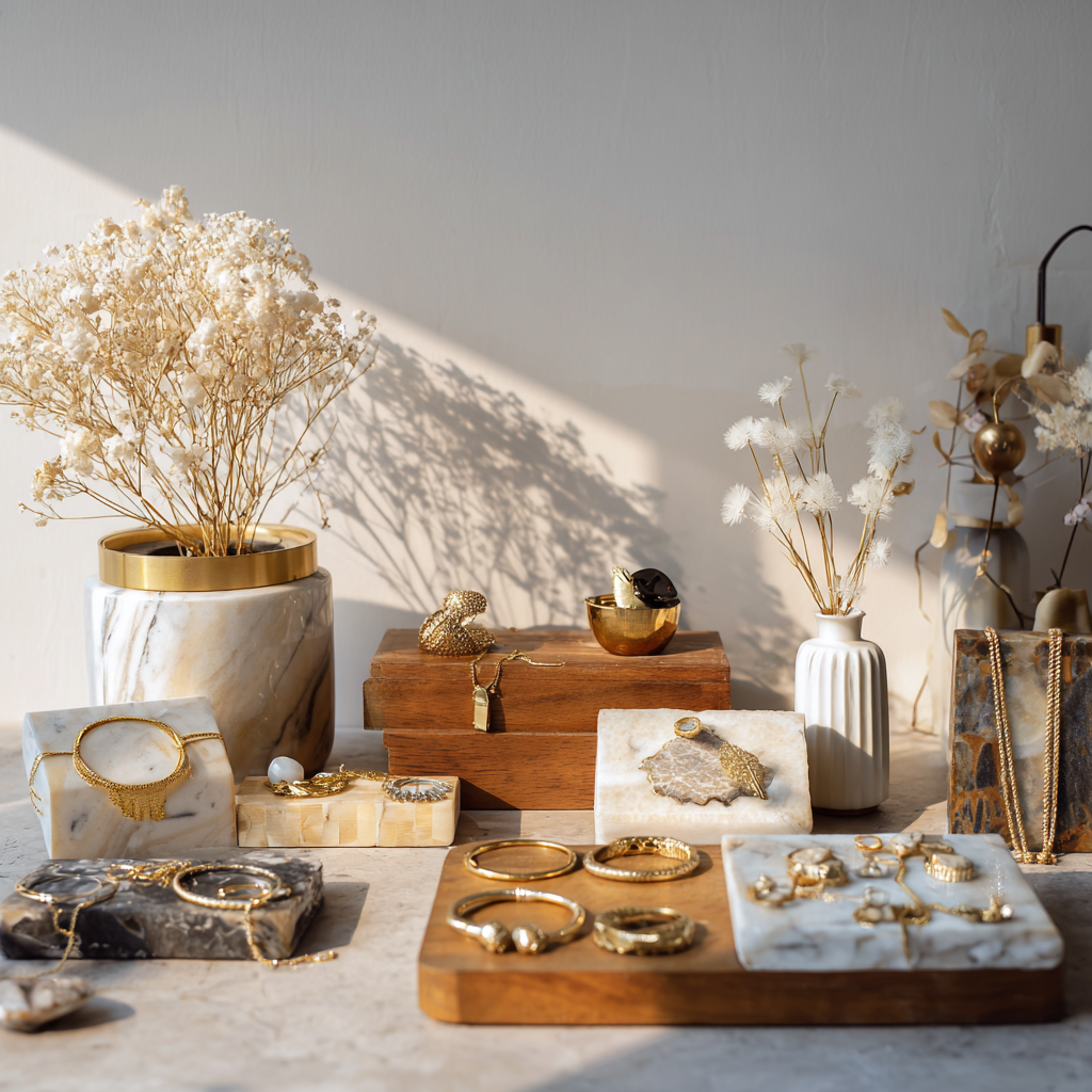 Our designs draw from the beauty of nature — soft lines, organic textures, and golden details that echo the effortless elegance of the world around us.